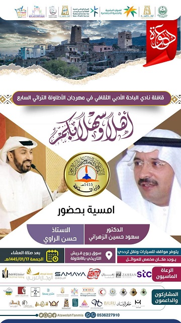 إعلام الموقع : استضاف نادي الباحة الأدبي والثقافي في يوم الجمعة 4 أغسطس 2023 الدكتور سعود بن حسين الزهراني في قافلته الثقافية والتي حطت رحالها في مهرجان الأطاولة التراثي السابع وشارك في التنظيم جمعية التنمية الاجتماعية بالأطاولة وإدارة المهرجان التراثي .