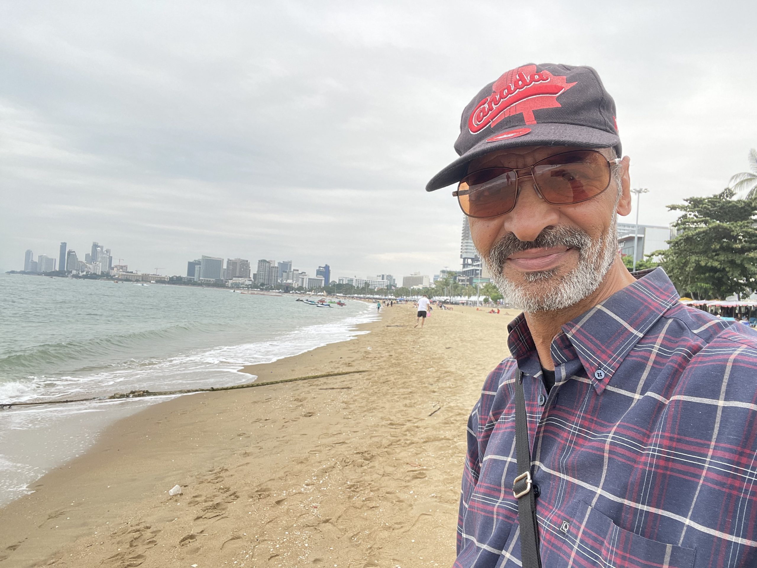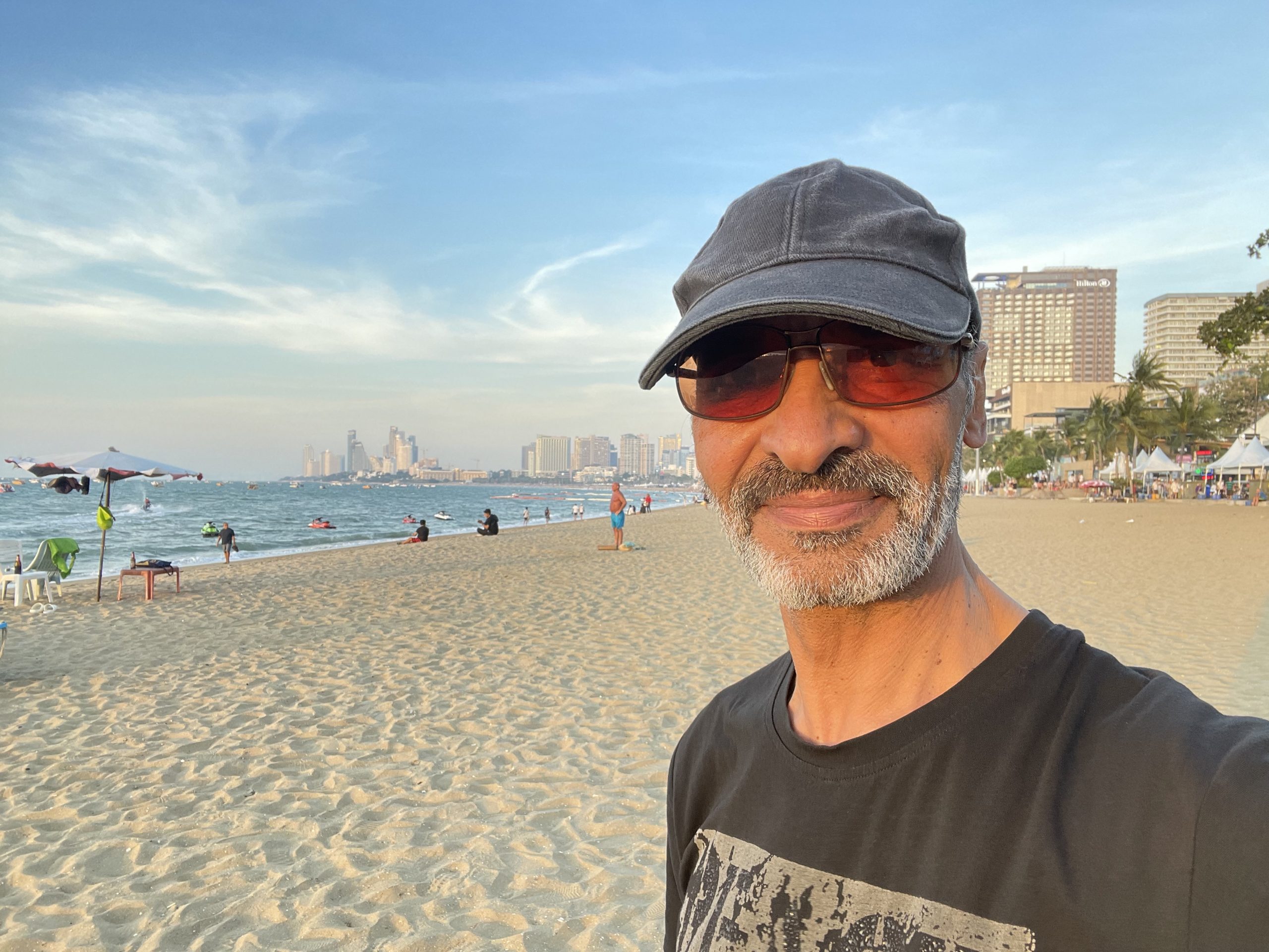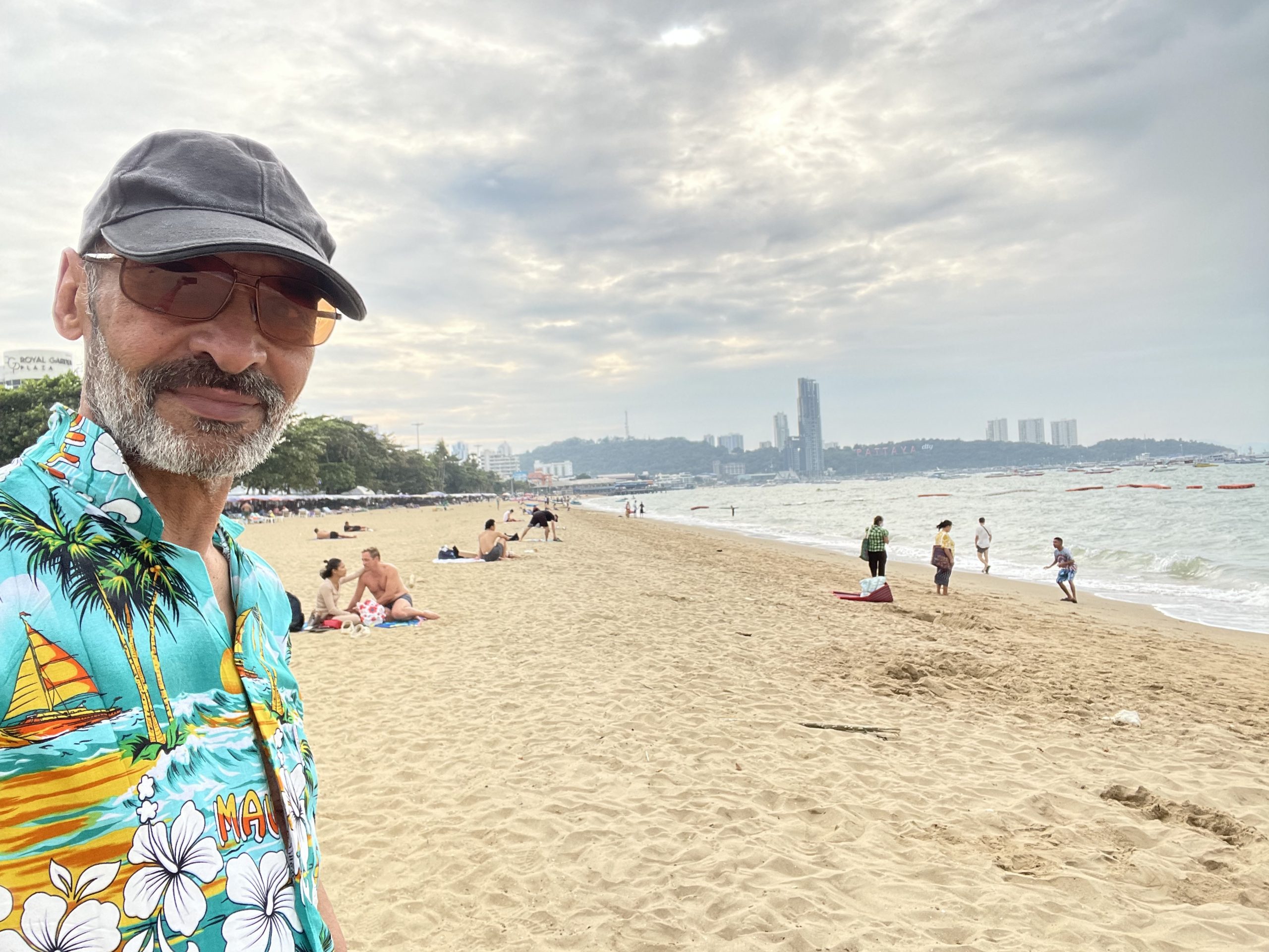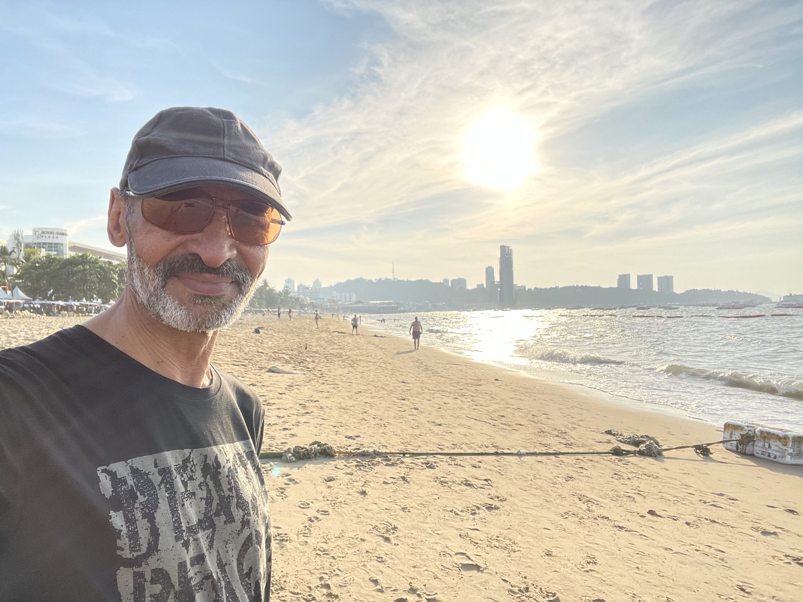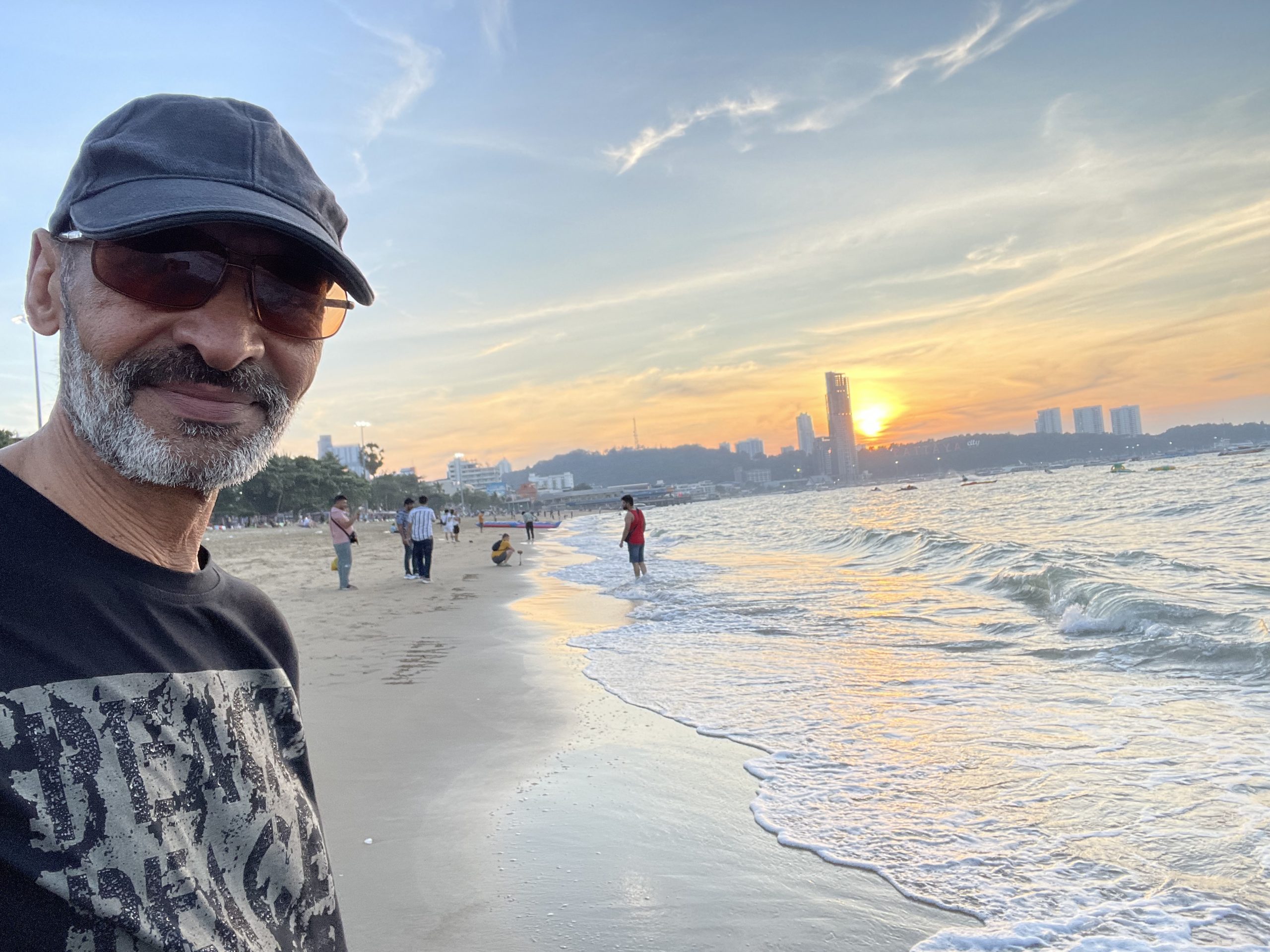 الإطلالة الرابعة ، من شاطيء جومتين في مدينة باتايا المزدحمة بالسواح من جميع دول العالم وخاصة الهنود حيث يشكلون غالبية السواح في المدينة ، ويصادف تواجدي أجواء صافية ومعتدلة .