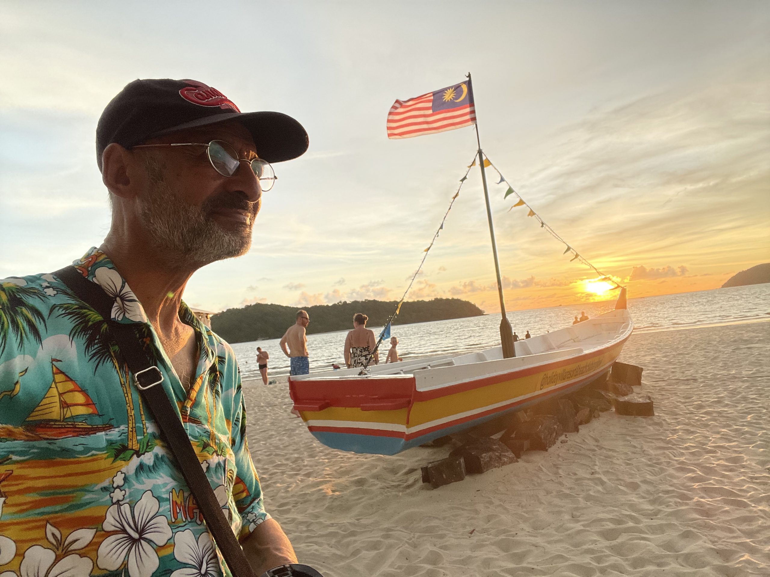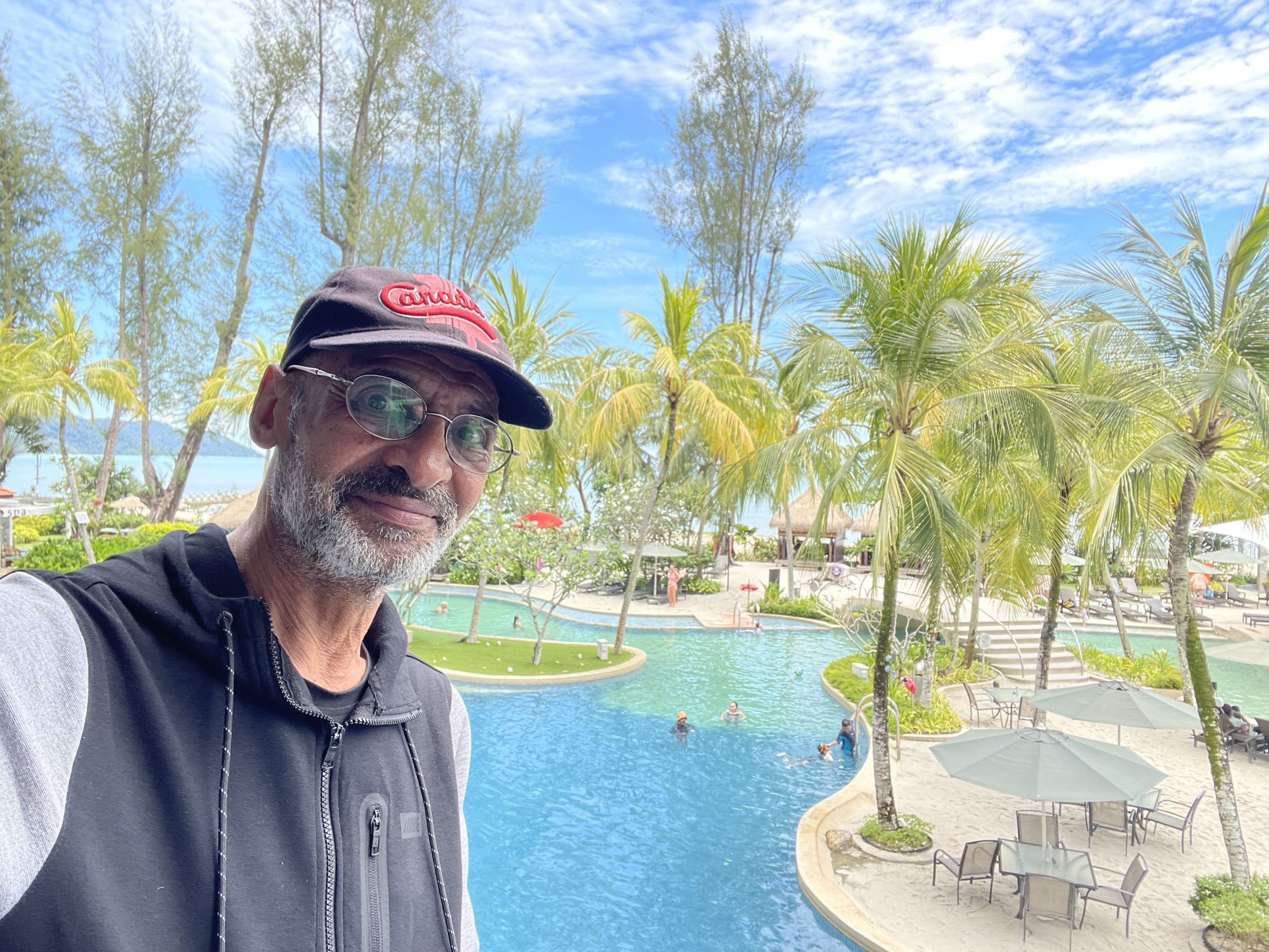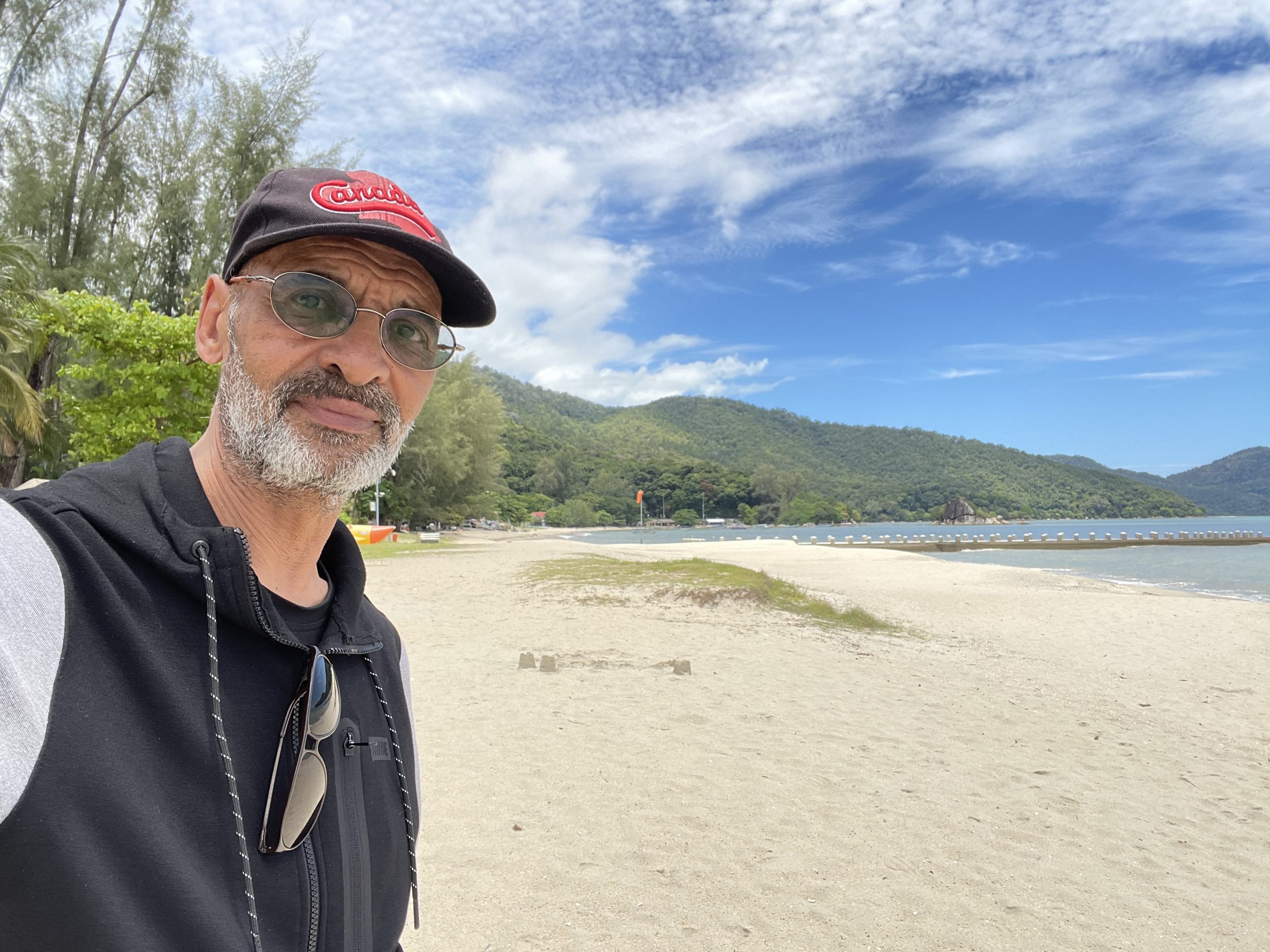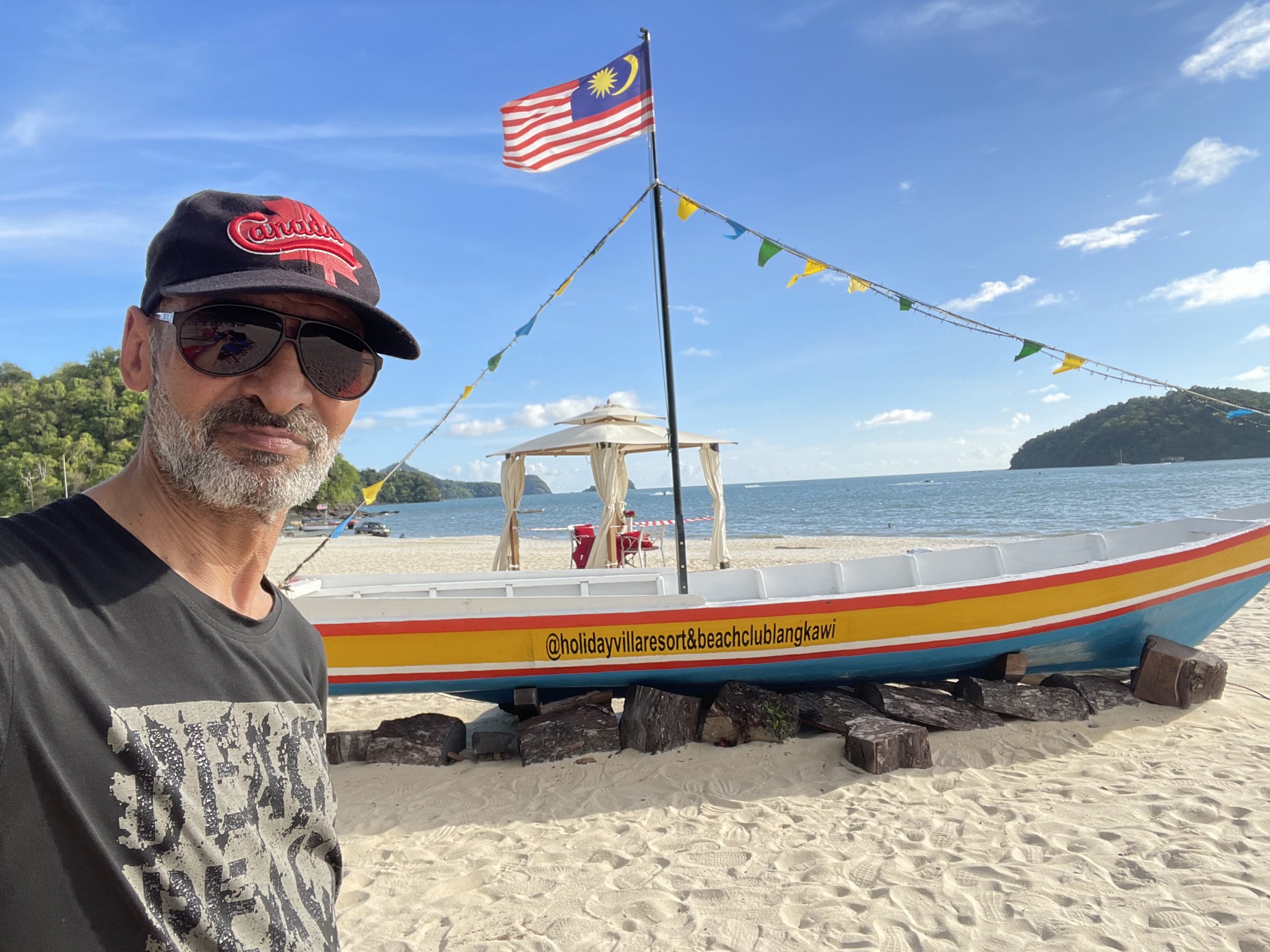 7- الإطلالة السابعة من المحطة الثانية في رحلتي السياحية على شاطيء البحر في مكان إقامتي بجزيرة لنكاوي ، حيث الرمال البيضاء ومياه البحر الزرقاء والأشجار والزهور الاستوائية في أجواء صافية ومعتدلة .