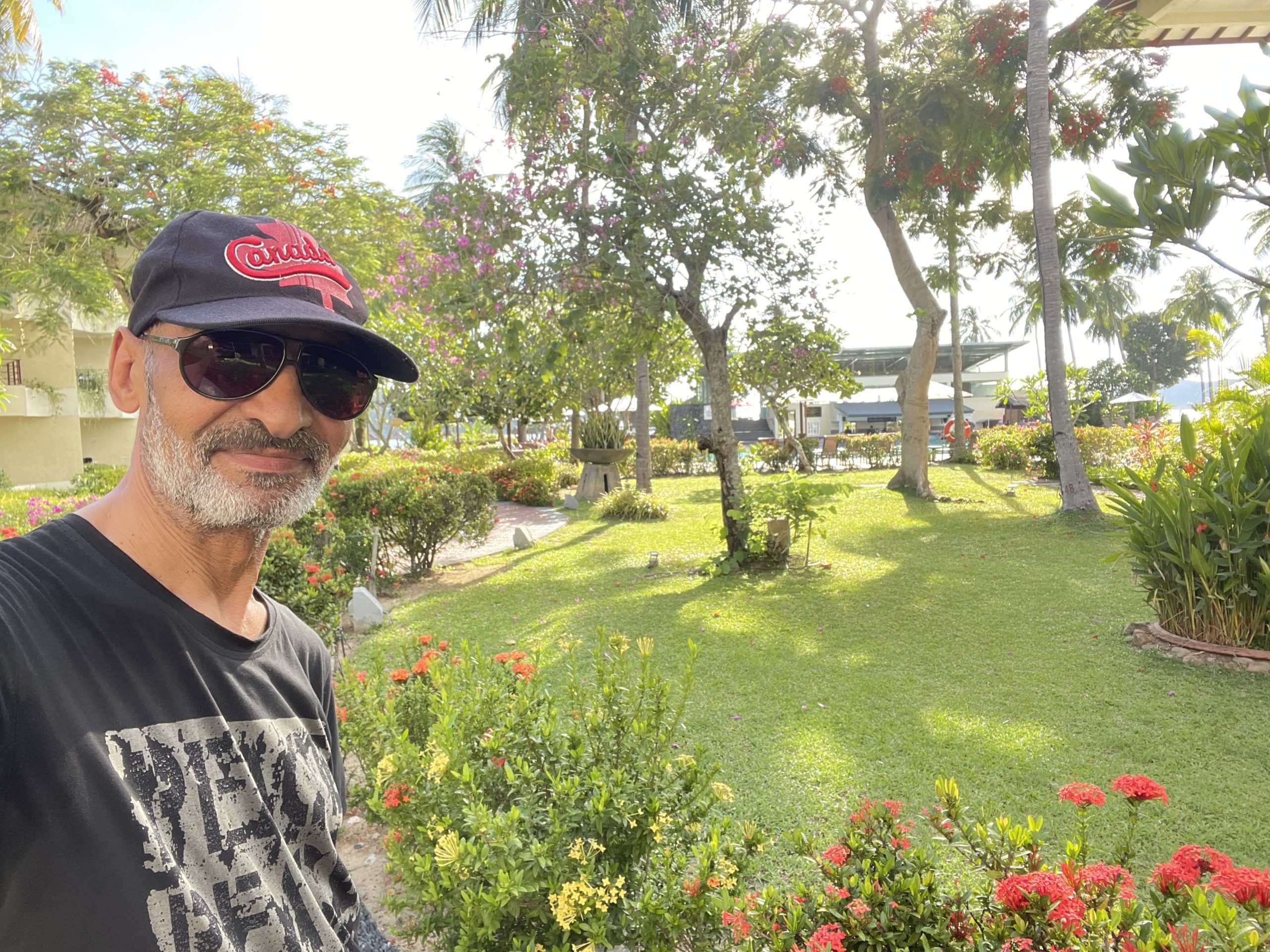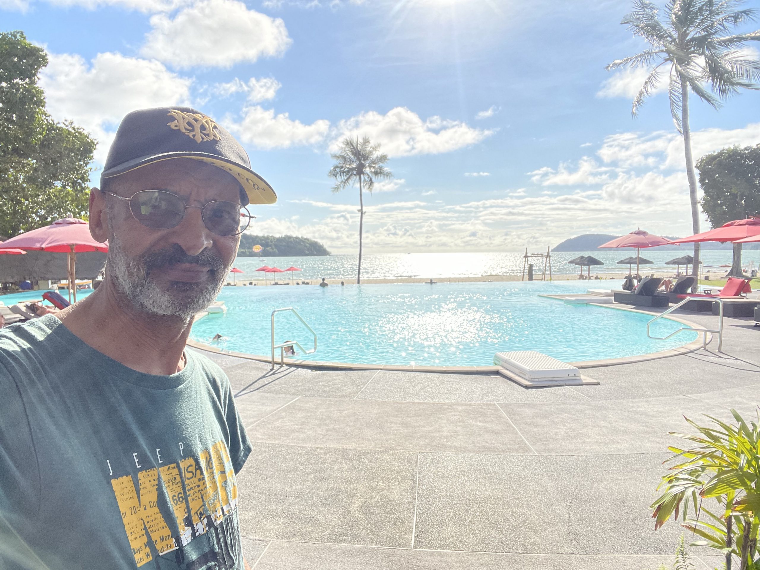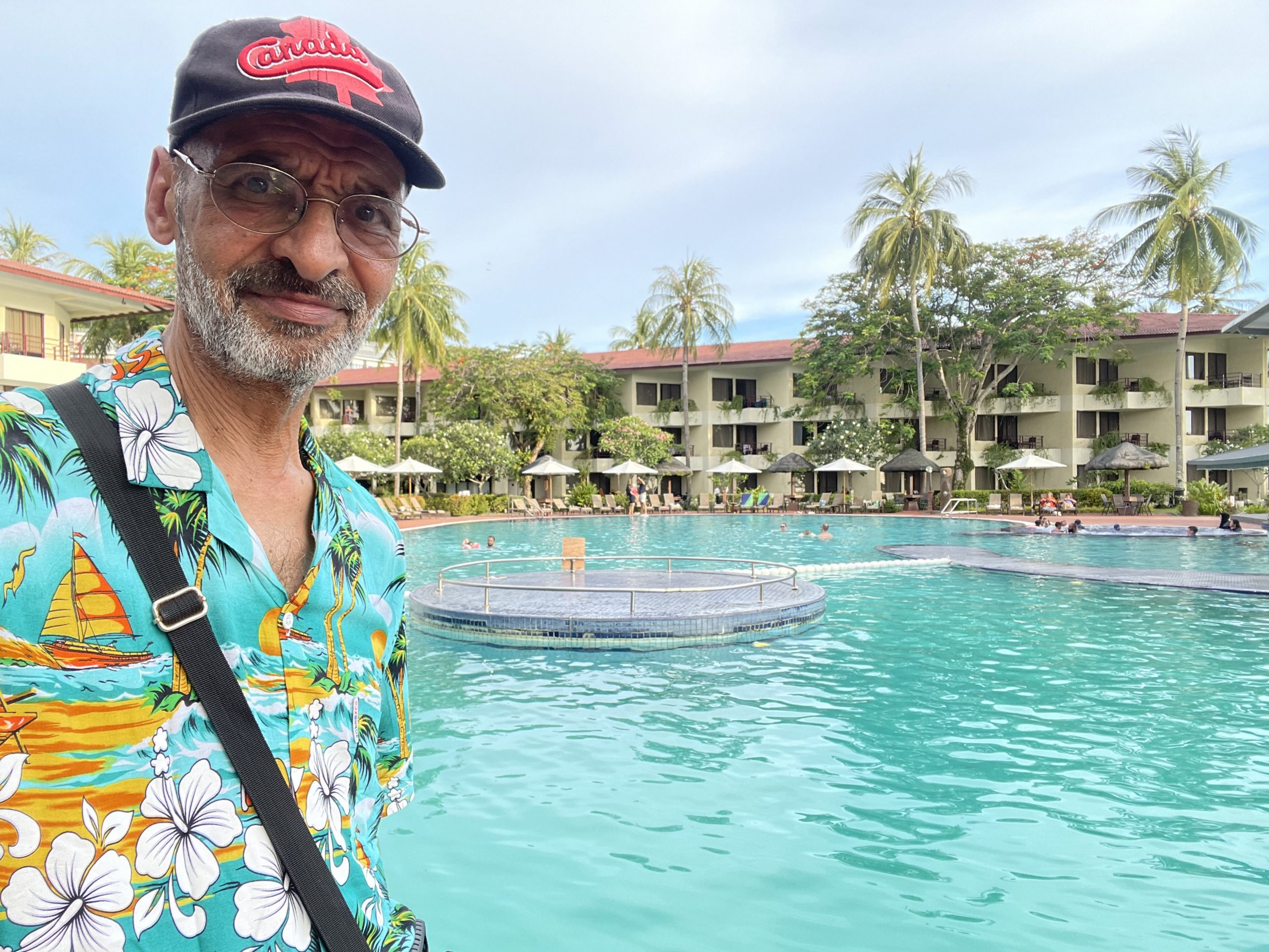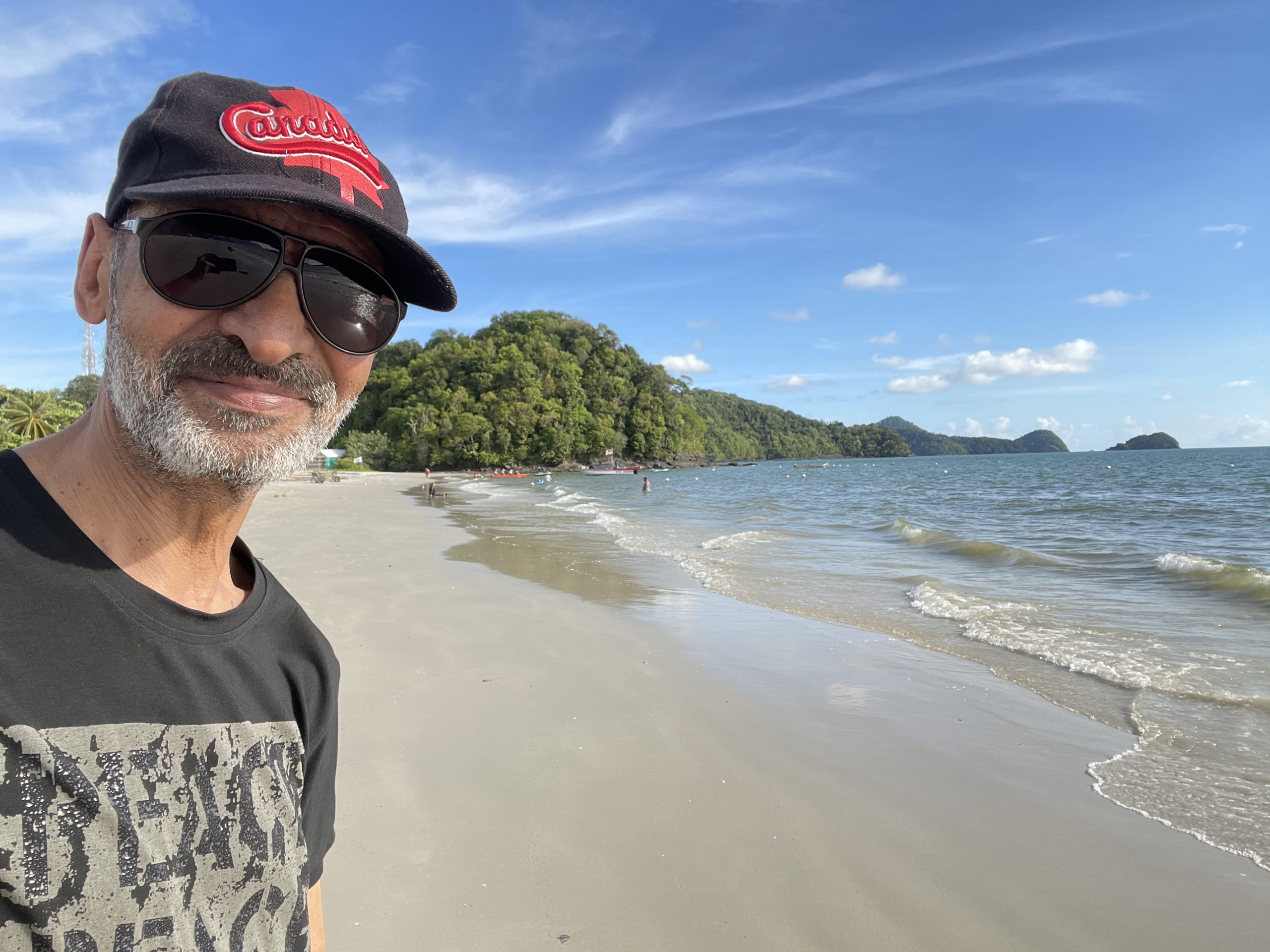 7- الإطلالة السابعة من المحطة الثانية في رحلتي السياحية على شاطيء البحر في مكان إقامتي بجزيرة لنكاوي ، حيث الرمال البيضاء ومياه البحر الزرقاء والأشجار والزهور الاستوائية في أجواء صافية ومعتدلة .