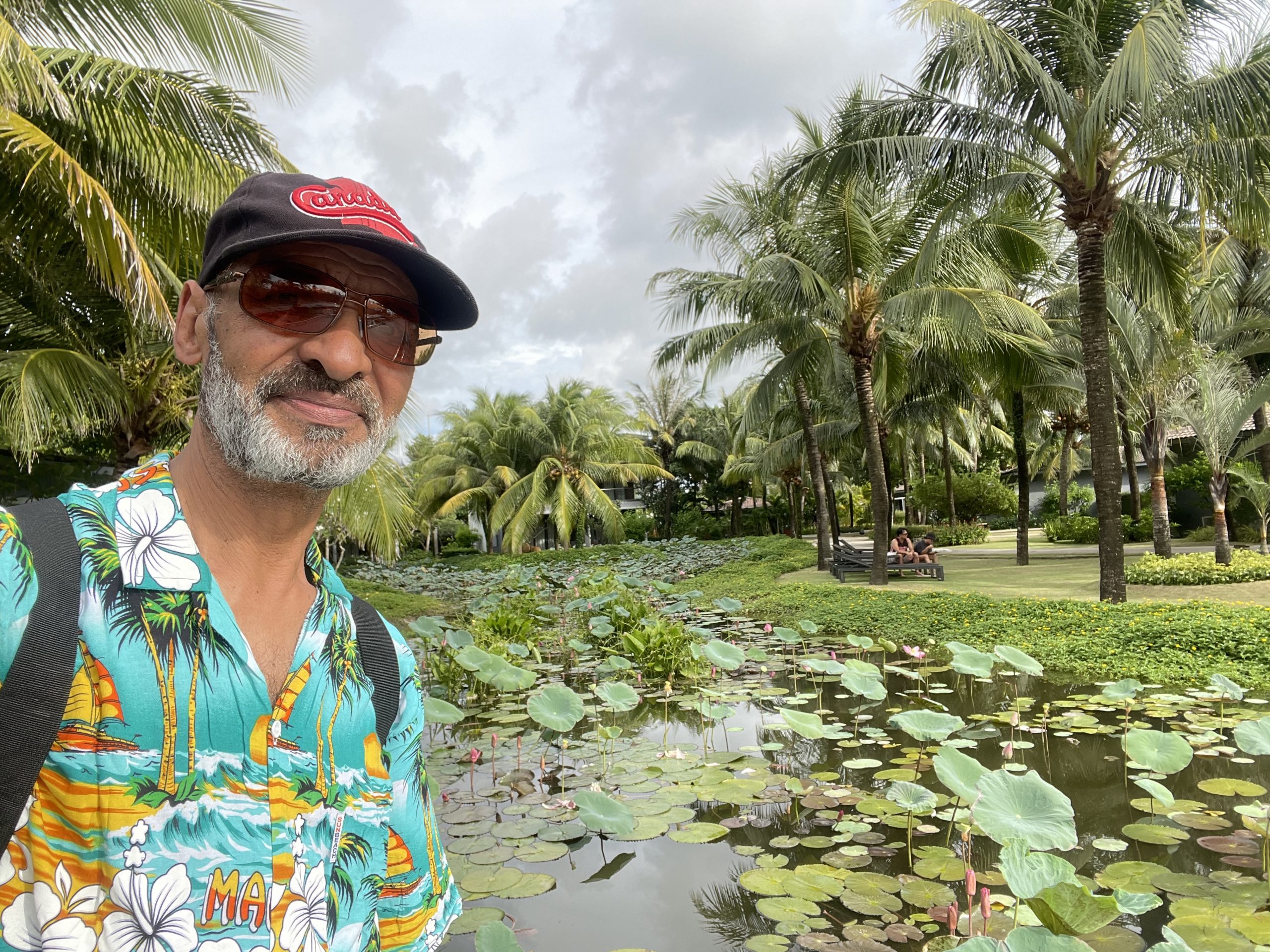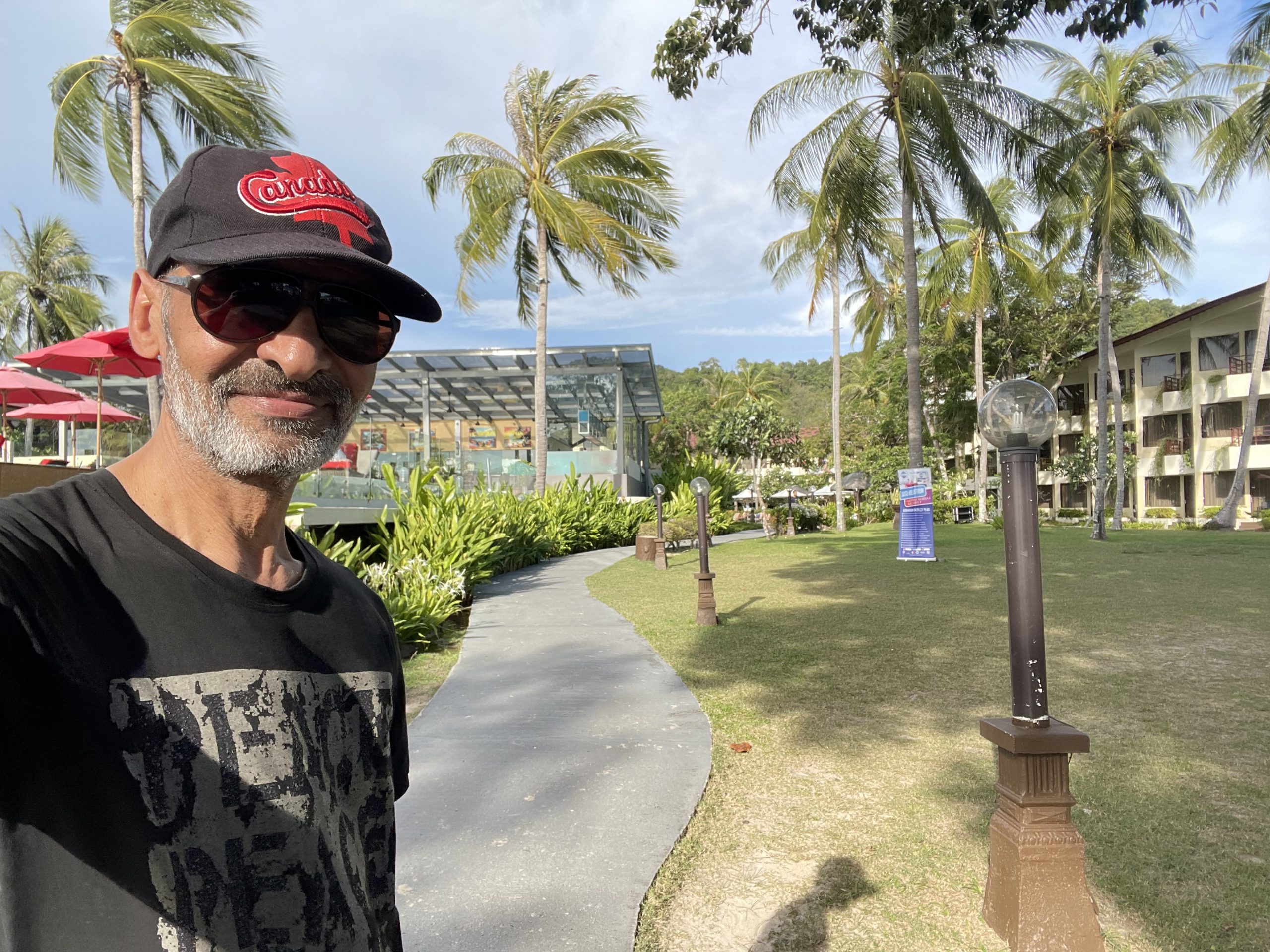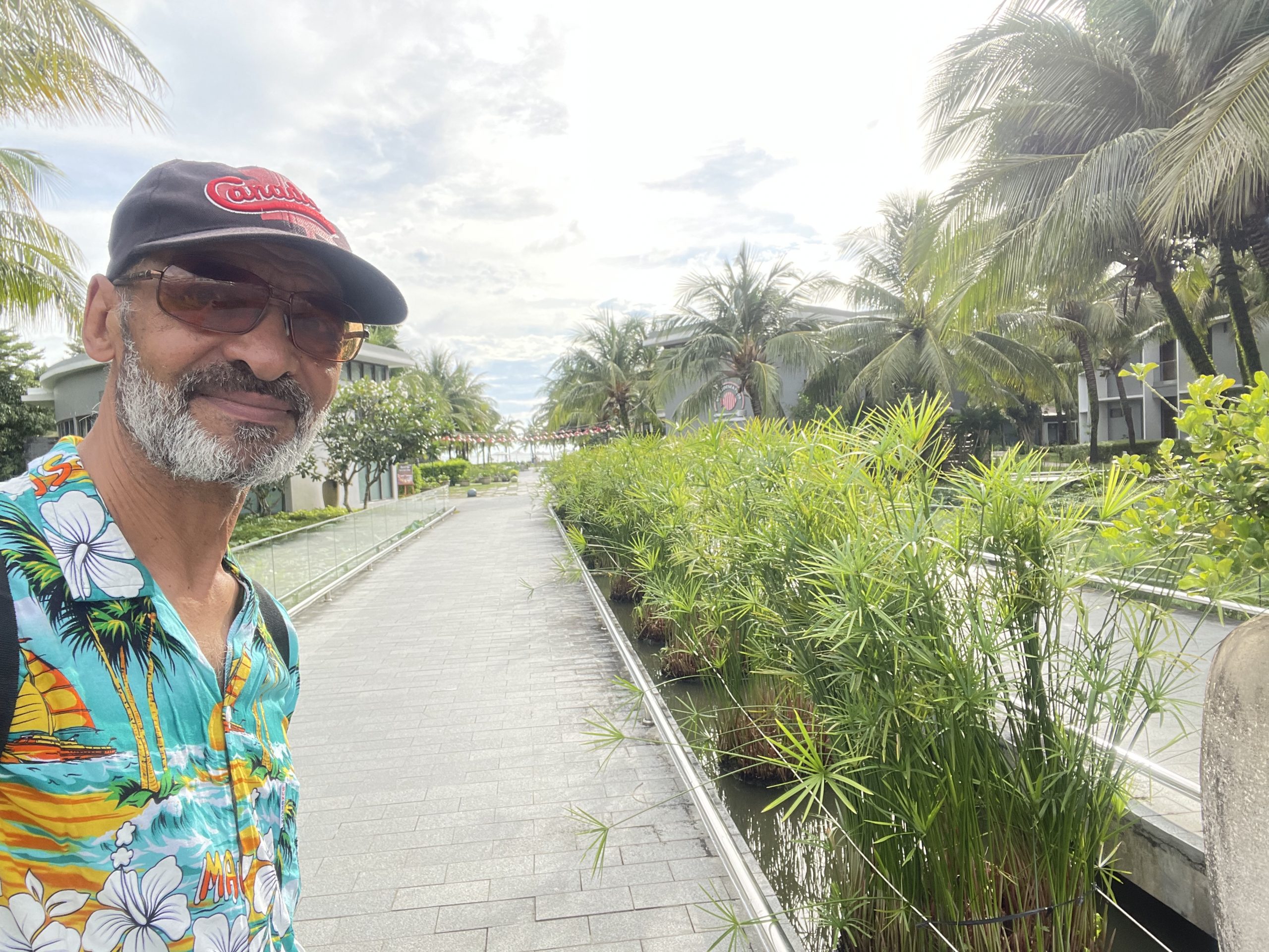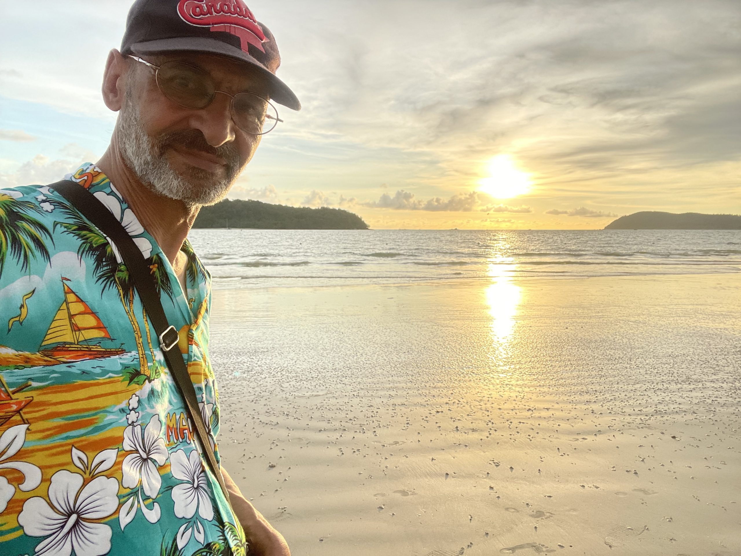 7- الإطلالة السابعة من المحطة الثانية في رحلتي السياحية على شاطيء البحر في مكان إقامتي بجزيرة لنكاوي ، حيث الرمال البيضاء ومياه البحر الزرقاء والأشجار والزهور الاستوائية في أجواء صافية ومعتدلة .
