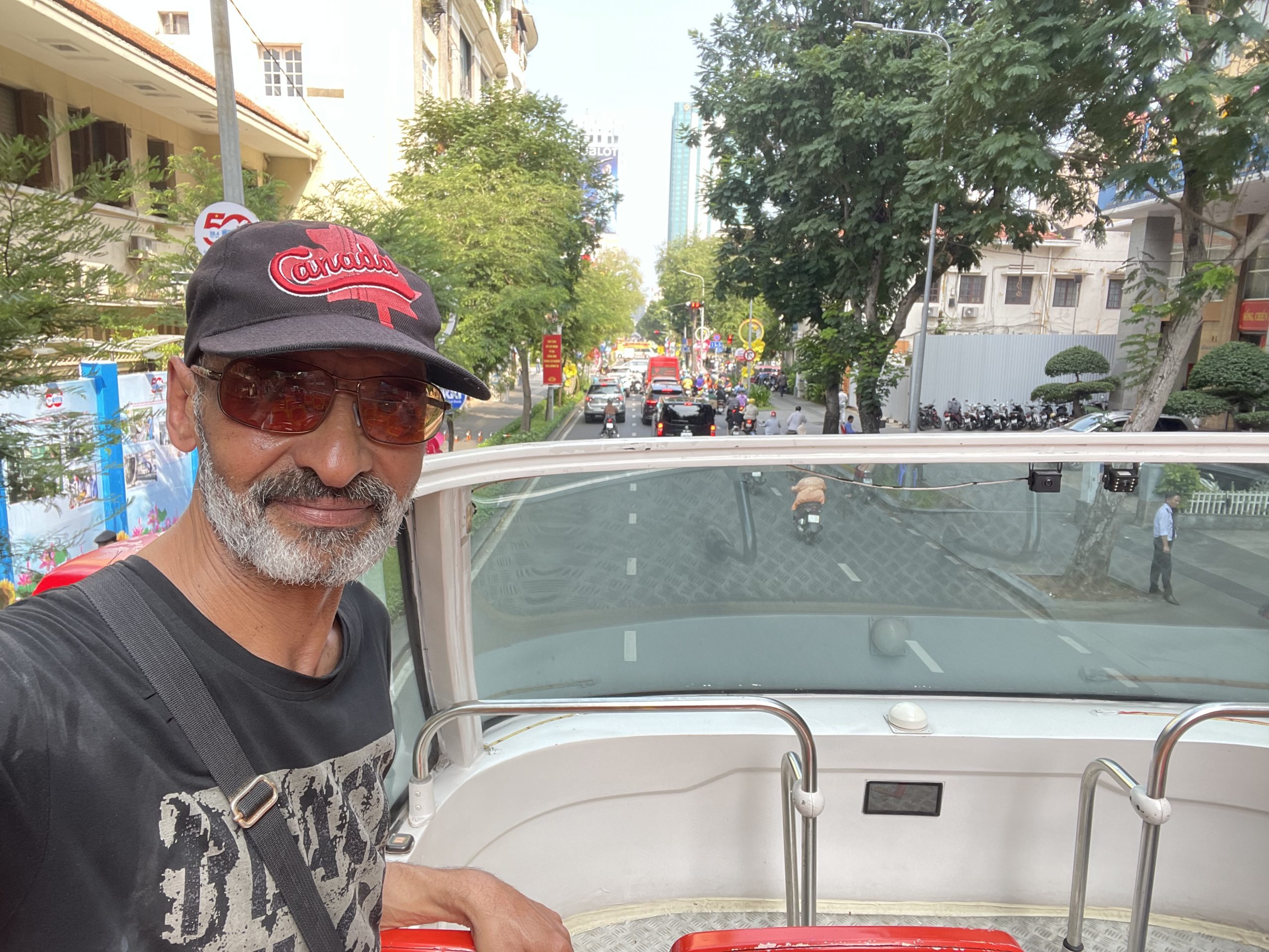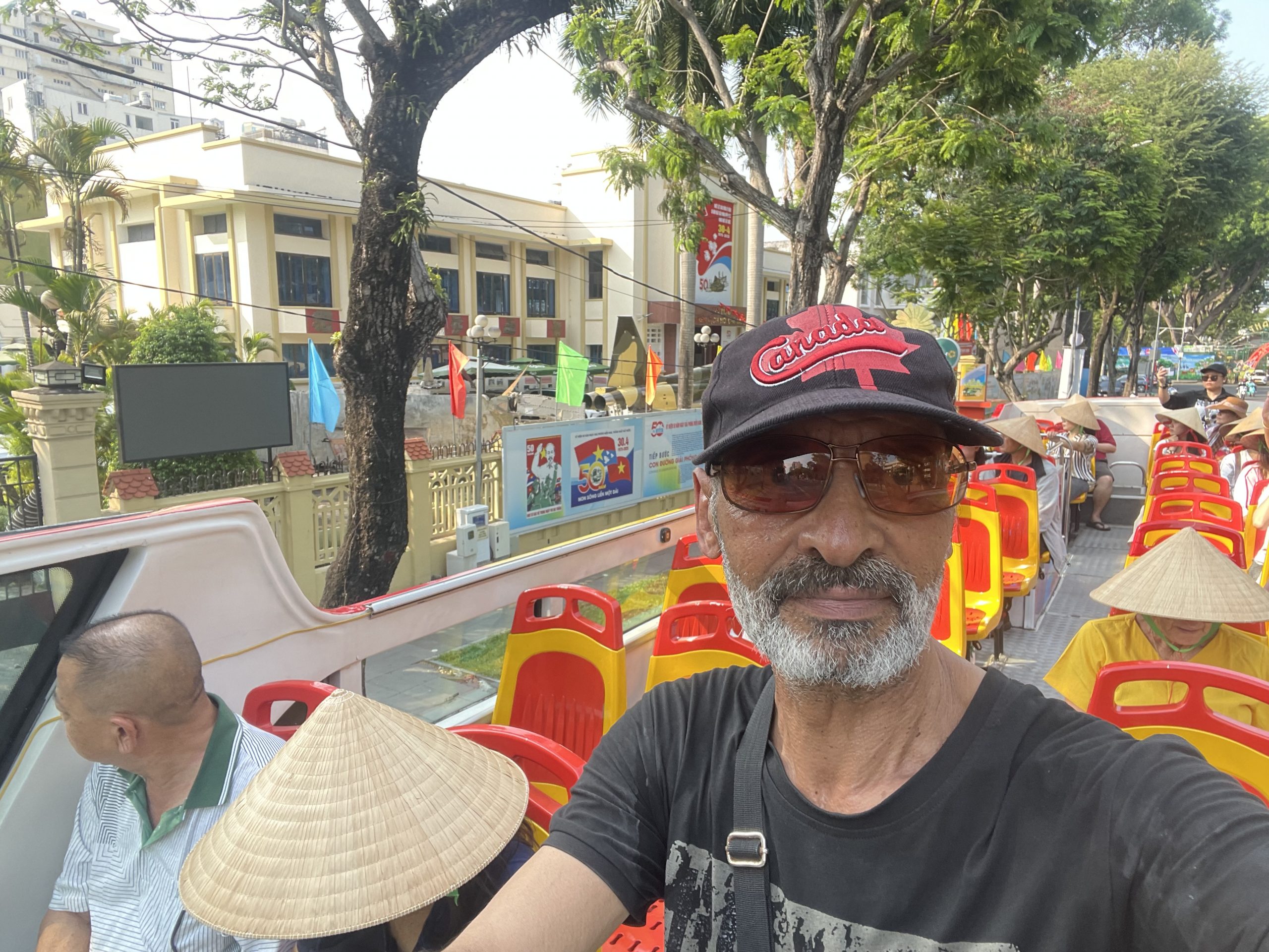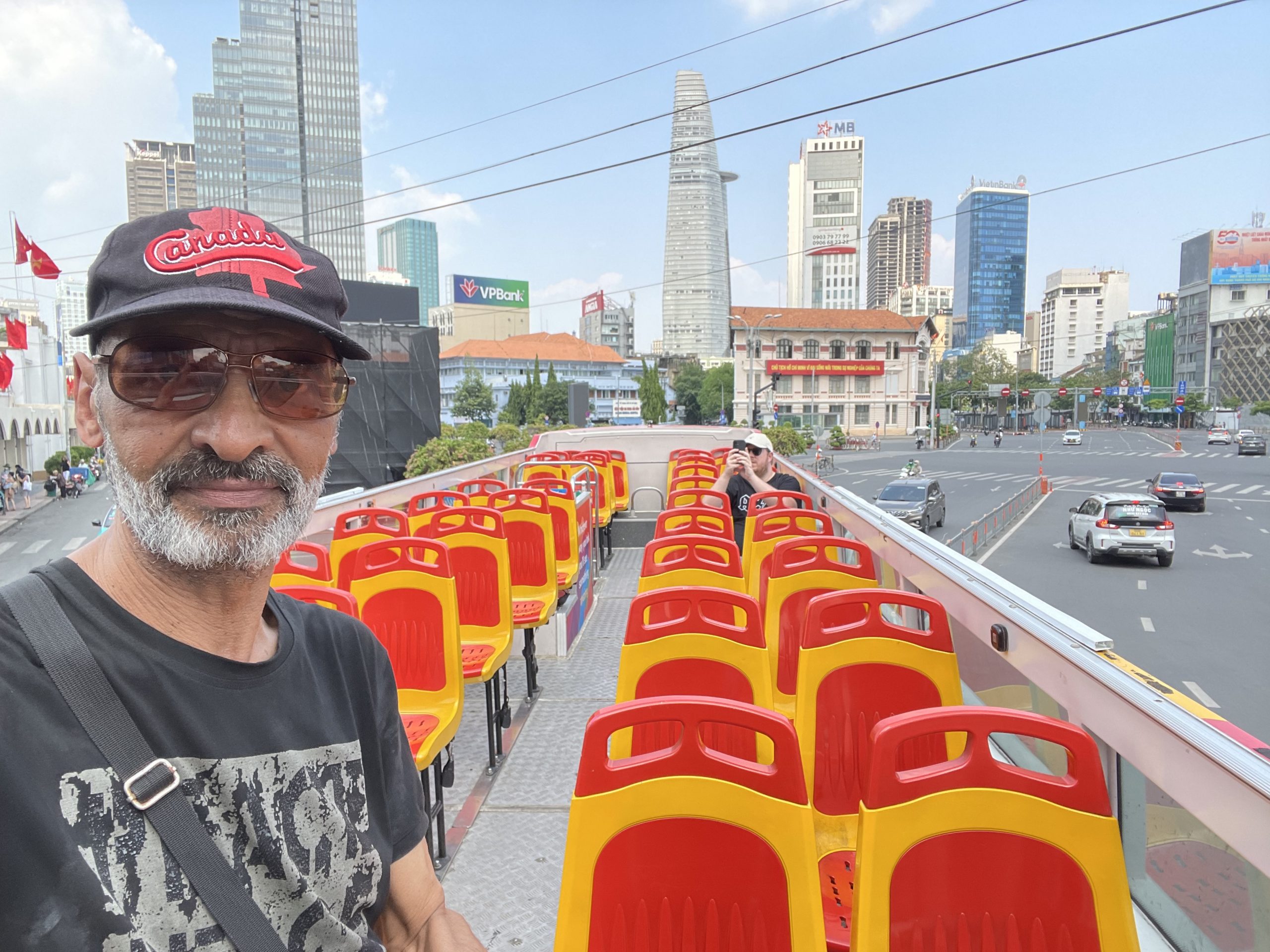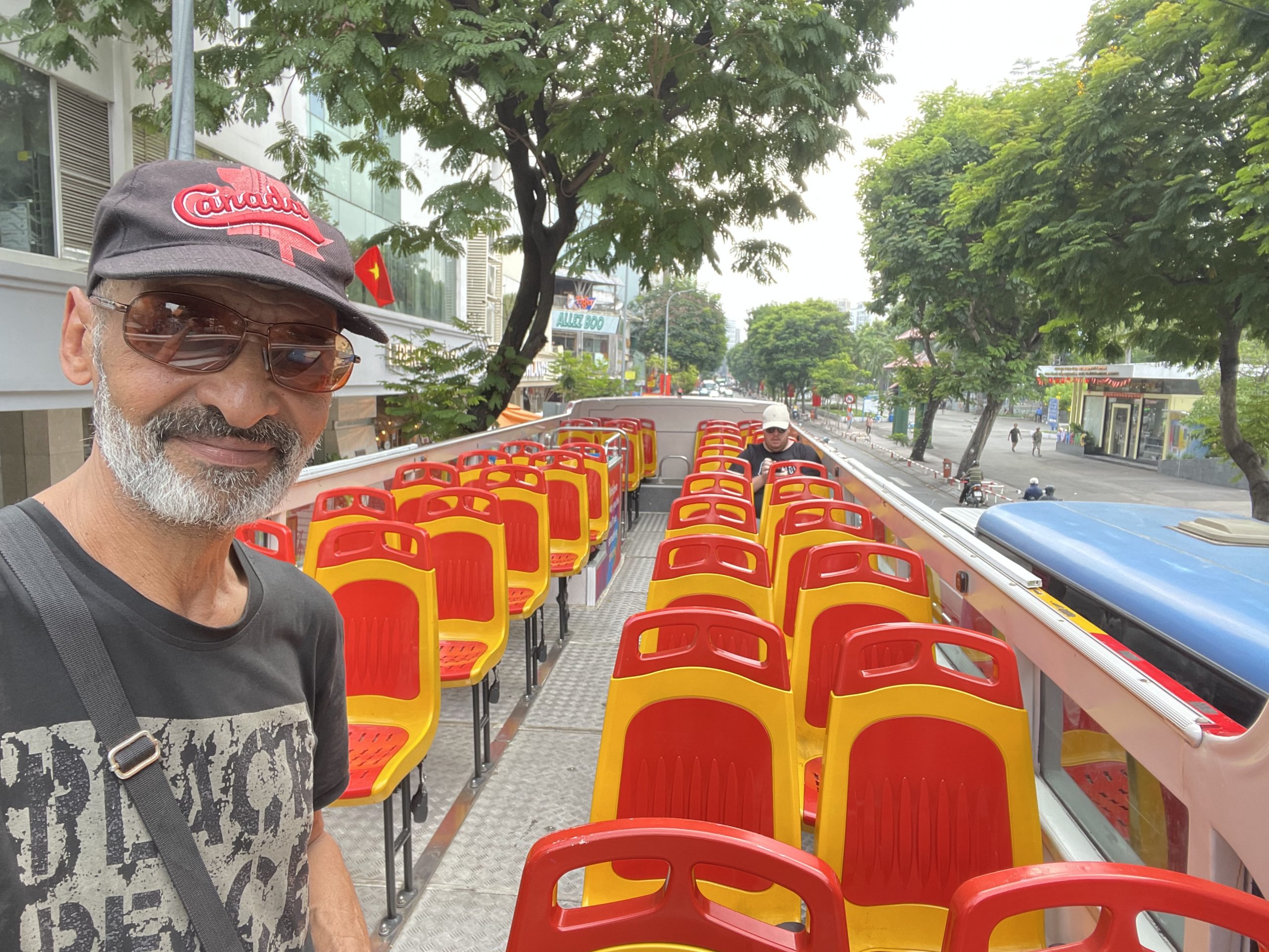 22- الإطلالة الثانية والعشرين في الباص السياحي في هوتشي منه المسار الأحمر والذي يطوف بأغلب المعالم السياحية والحضارية في المدينة وهناك مسار آخر أزرق ومسار برتقالي ، الجو صافي وحار .